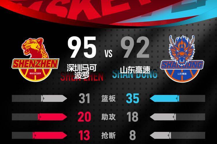 第四节,双方展开激烈争夺,山东高速与深圳马可波罗的分数不断交替上升,双方在场上互不相让,战况胶着。山东高速的马基斯·克里斯在本节砍下11分,展现了出色的得分能力。最终,凭借着王浩然终场前1秒的三分绝杀,深圳马可波罗以95-92赢得比赛。