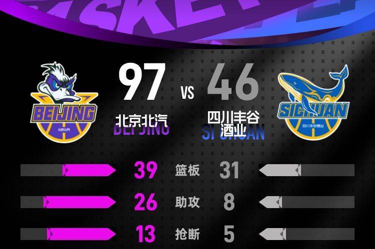 第四节,四川丰谷酒业在努力缩小分差的过程中,将比分追至42-80。尽管北京北汽随后通过一波进攻将优势扩大至51分,但四川丰谷酒业在小节后段再次发力,挽回部分分差。最终,北京北汽以97-46赢下比赛。